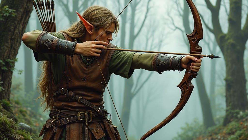 A striking picture of an elf archer drawing back a longbow in a misty forest. The image is rendered in a dynamic fantasy art style with delicate linework and atmospheric lighting.