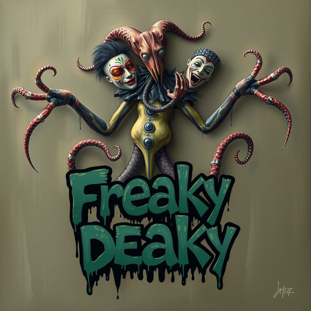 Large dancing harlequin/squid hybrid; prominent tentacles; kabuki mask; african mask; oil painting; fear and dread; maniacal; surreal, influenced by . Below the image, text that says "Freaky Deaky" in 3D bold wavy dripping horror font, distressed, shades of green and gray, with a dark outline and drop ...