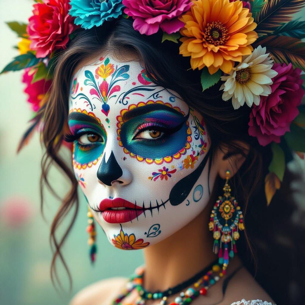 This image shows a woman with vibrant Día de los Muertos face paint. The surreal, hyperrealistic style features intricate sugar skull designs, flowers, and feathers, creating a softly focused and delicately lit portrait.