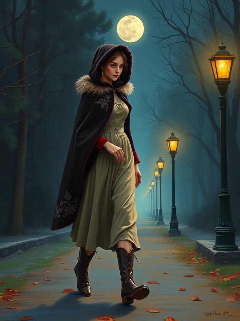 This image depicts a serene 19th-century woman strolling through a juniper forest at dusk, surrounded by the warm glow of gas lamps and the soft light of the full moon. The scene is rendered in a neo-impressionist, expressionist style, with thick, textured brushstrokes and vivid colors reminiscent of Van...