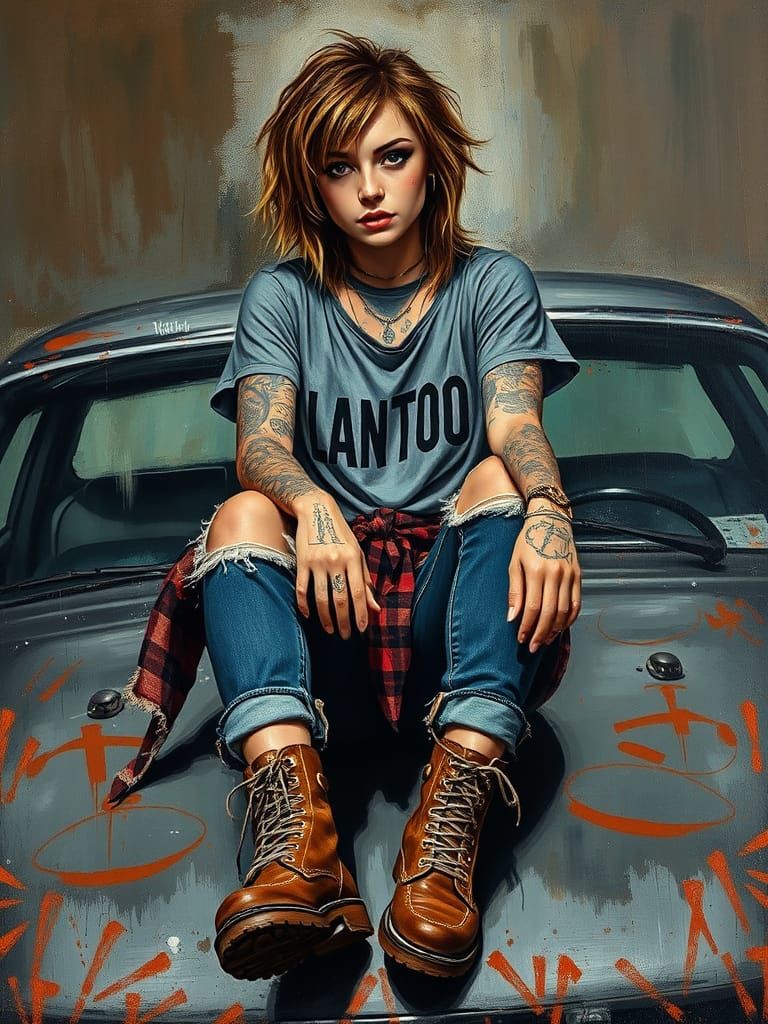 A grunge oil painting scene of a rebel tattooed 20 year old woman sitting on a car hood She has layered uneven cut hair, dark eyeliner, logo T shirt, flannel top tied around her waist, ripped denim jeans, combat boots with untied loose laces, painterly, thick impasto, palette knife edging