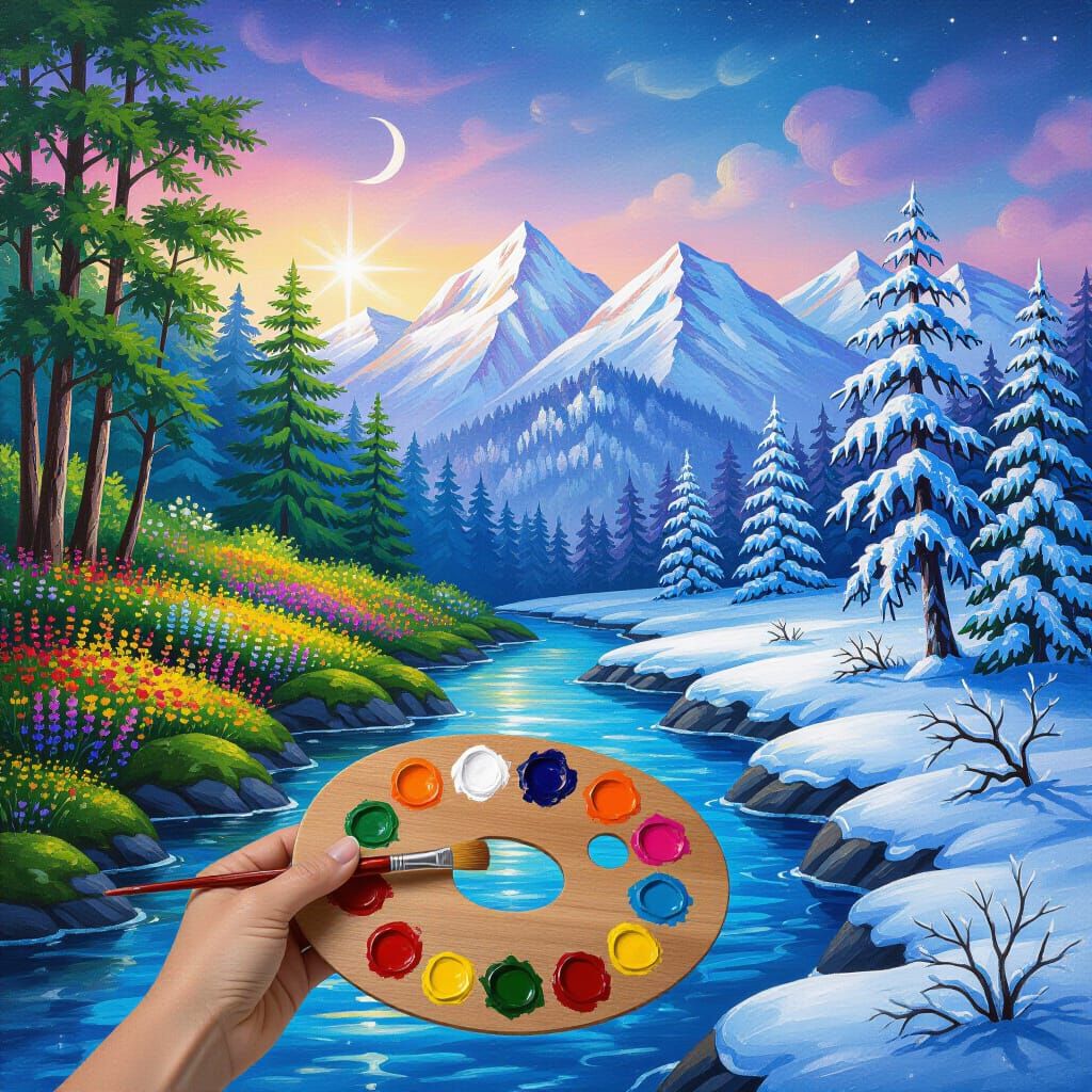 A vibrant mountain landscape is painted on an artist's palette, held in a hand. The scene blends summer and winter, with lush forests transitioning to a frosty, snow-covered landscape in a whimsical style.