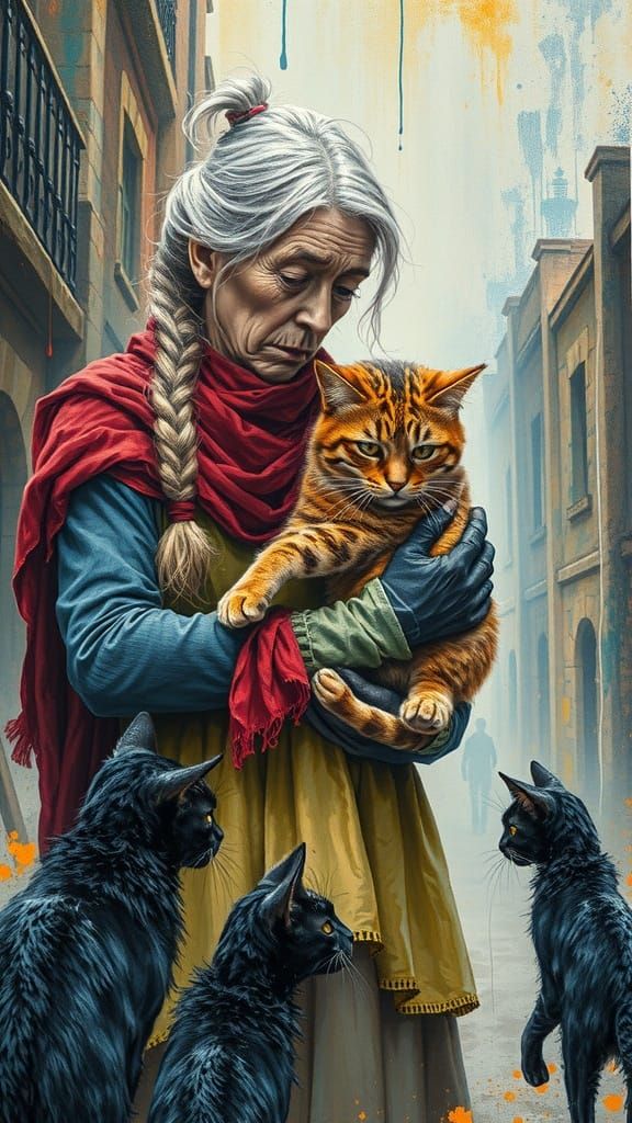 This image depicts a disturbed elderly woman with braided hair, a red scarf, and fingerless gloves, holding a large cat amidst a desolate city. Rendered in a neo-impressionist and expressionist style with vivid colors and thick textures.