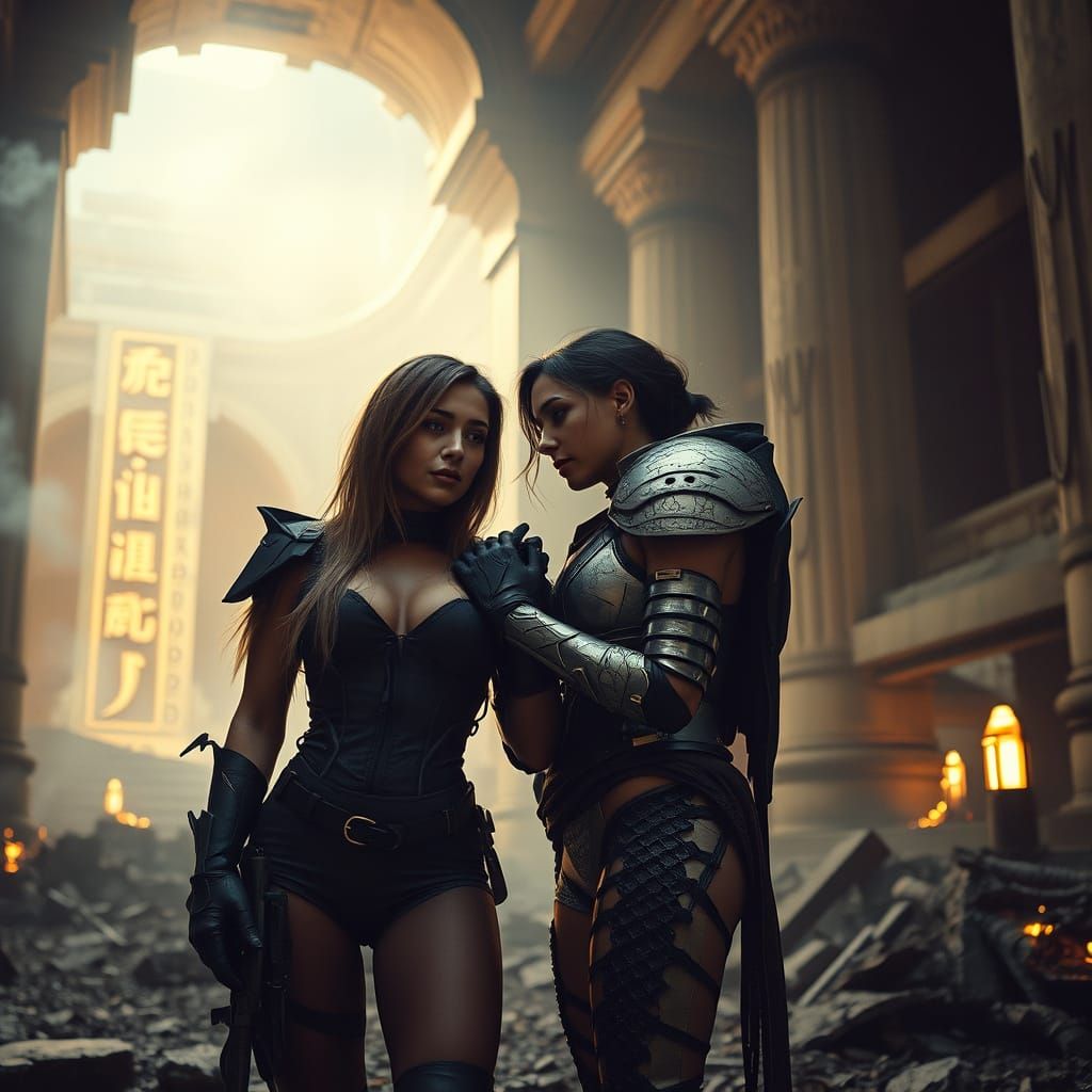 This image shows two women embracing in a ruined temple filled with glowing glyphs and decay. This cinematic image suggests both desire and despair in a futuristic, film-inspired style.