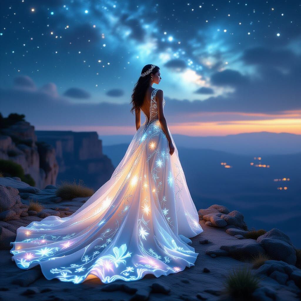 A striking picture of a woman in an avant-garde gown of glowing flora and crystals. The scene is set on a rocky cliff under a nebula-filled sky, with cinematic realism.