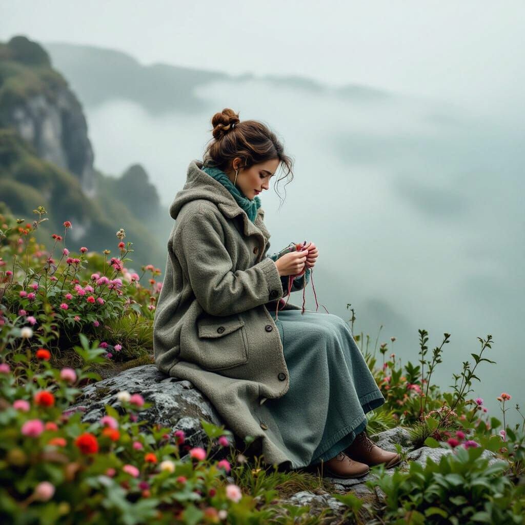 This image shows a woman knitting on a rock, enveloped by plants in a foggy landscape. The scene is rendered with whimsical details and dreamy atmospherics, as digital art.