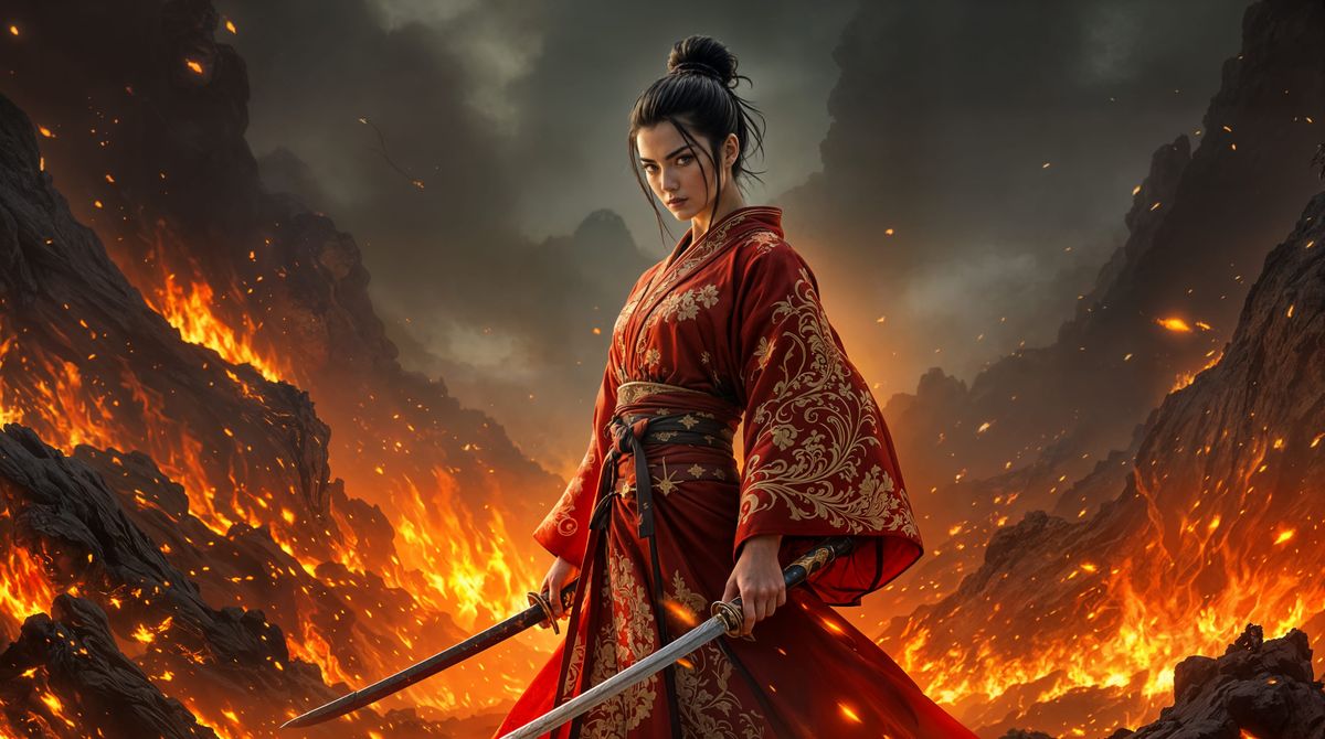 A dramatic illustration of a resolute female warrior in a vibrant red kimono standing firm amidst a fiery, war-torn landscape with intense flames and dramatic lighting