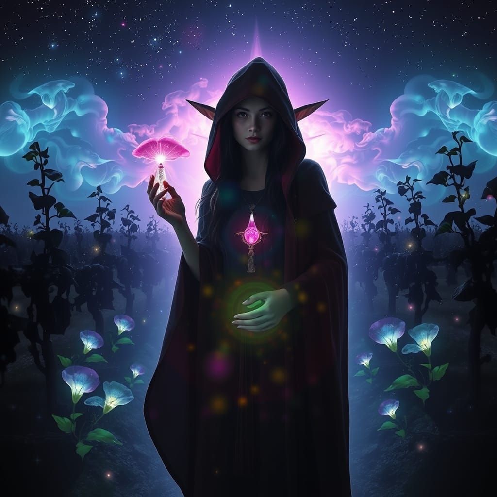 This image shows an otherworldly elf witch surrounded by a coronal aura, captured in a stylized, electro-magnetic effect reminiscent of kirlian photography. She stands amidst a lush morning glory vineyard, her hooded cloak and ankh symbolizing mysticism and ancient magic.