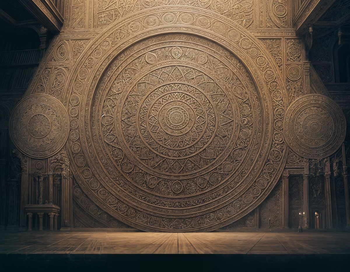 This image shows a stunning, intricately detailed digital painting of a 528hz mandala on the walls of an organic building, set in a cinematic and atmospheric scene.
