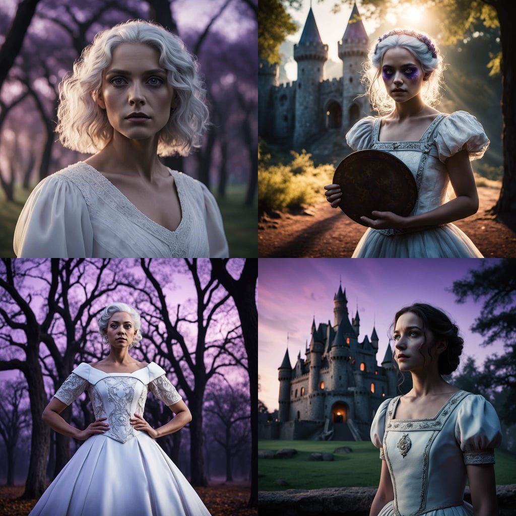 A hyperphotorealistic depiction of a strong-willed woman with a white dress and striking eyes, set against a serene yet ominous background.