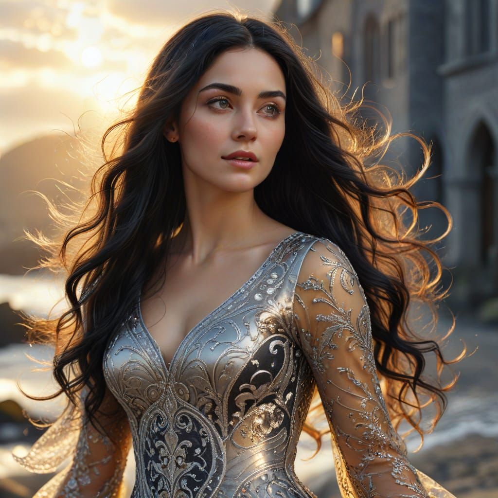 This image shows an Irish woman with long black hair and grey eyes wearing a vibrant dress. The portrait is rendered in a hyper-realistic digital art style with shining silver embroidery.