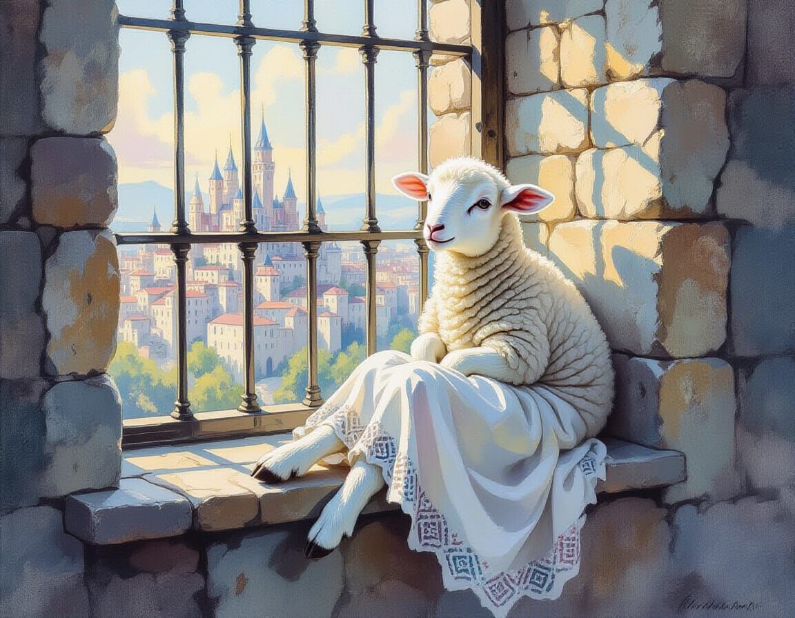 A dreamy image of a lamb perched on a barred windowsill. The lamb looks nervous as it gazes out at a kingdom below, rendered with impressionistic brushstrokes and a mystical ambiance.