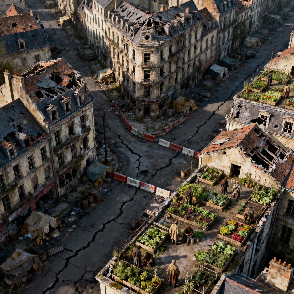 Aerial view of a ruined Bourges, France, in a 1960s urban style. Features cracked roads, damaged buildings, and signs of human resilience amidst decay, rendered with dramatic lighting.