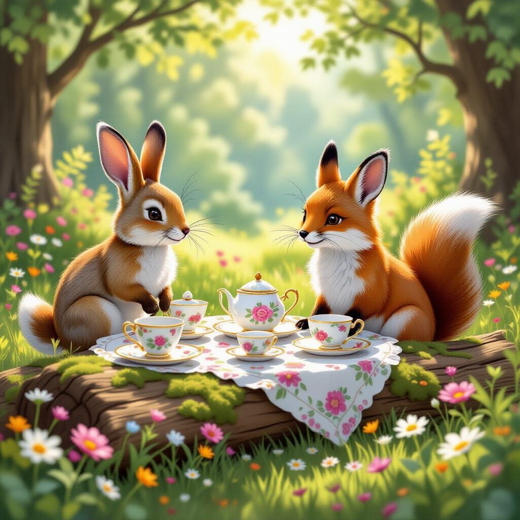 A charming storybook illustration of woodland animals enjoying a tea party amidst wildflowers. Features soft painterly textures and warm colors, evoking wonder and enchantment.