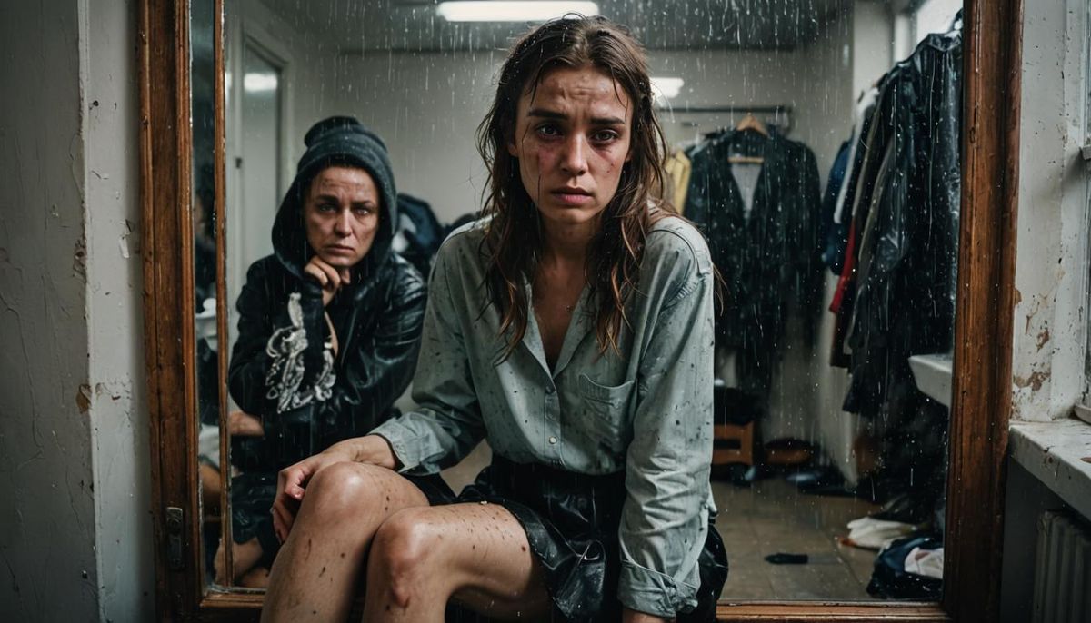 This image shows a melancholic woman in an artist's dressing room, removing her tights. Rain falls outside the window. The portrait is lit with ambient light, reminiscent of fine art photography.