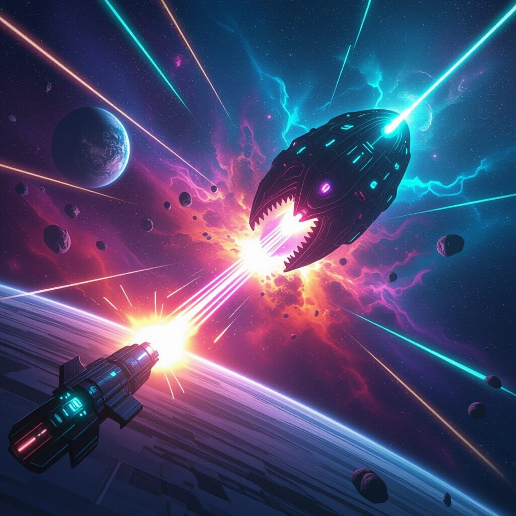 A cosmic entity emerges from a big bang, unleashing powerful lasers at a futuristic Earth, set against vibrant nebulae in a striking sci-fi aesthetic.