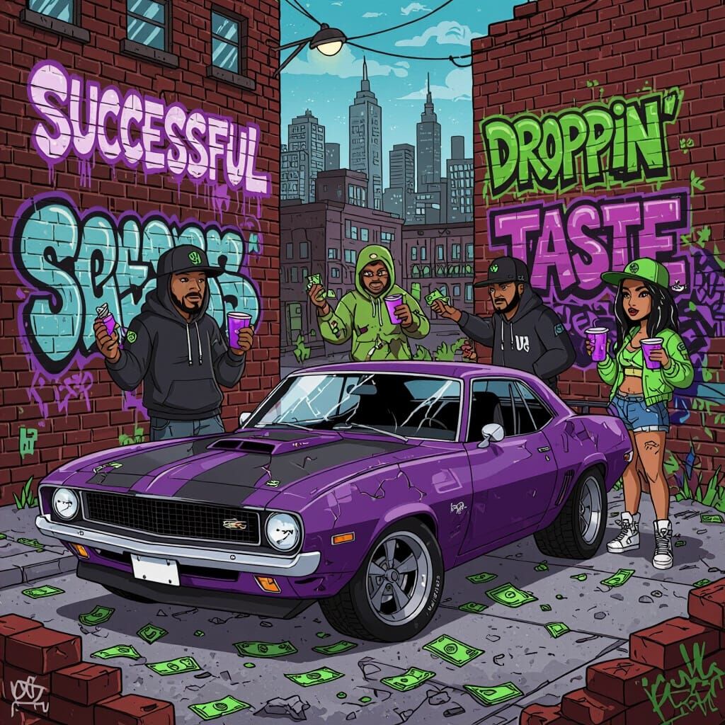 This image shows a vibrant urban neighborhood scene with a cartoon muscle car and residents in hoodies. Graffiti art covers brick walls, reflecting an urban comic aesthetic with bold lines and textures.