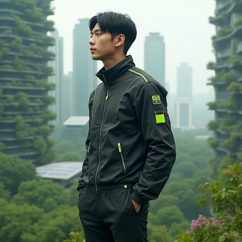 This image shows a stylish Chinese man in futuristic eco-tech clothing, standing confidently in a green cityscape. The artwork features bio-futuristic elements with a soft, natural glow.