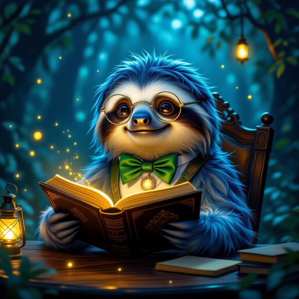 This image shows a blue sloth wearing glasses and a bow tie, seated at a desk in a forest at night. The sloth is reading a glowing book in a cinematic, ultra-realistic style.