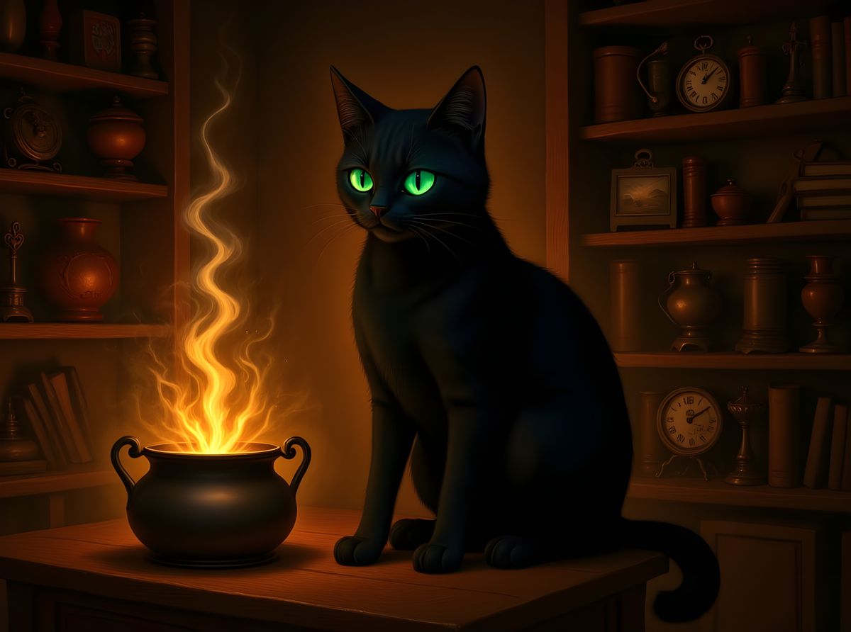 A whimsical witch's familiar, a sleek black cat with glowing green eyes, sits patiently beside a steaming cauldron in a cozy, cluttered cottage filled with arcane curiosities and overflowing bookshelves. The scene is bathed in the warm glow of a fireplace, rendered in a storybook illustration style with a touch of gothic charm.