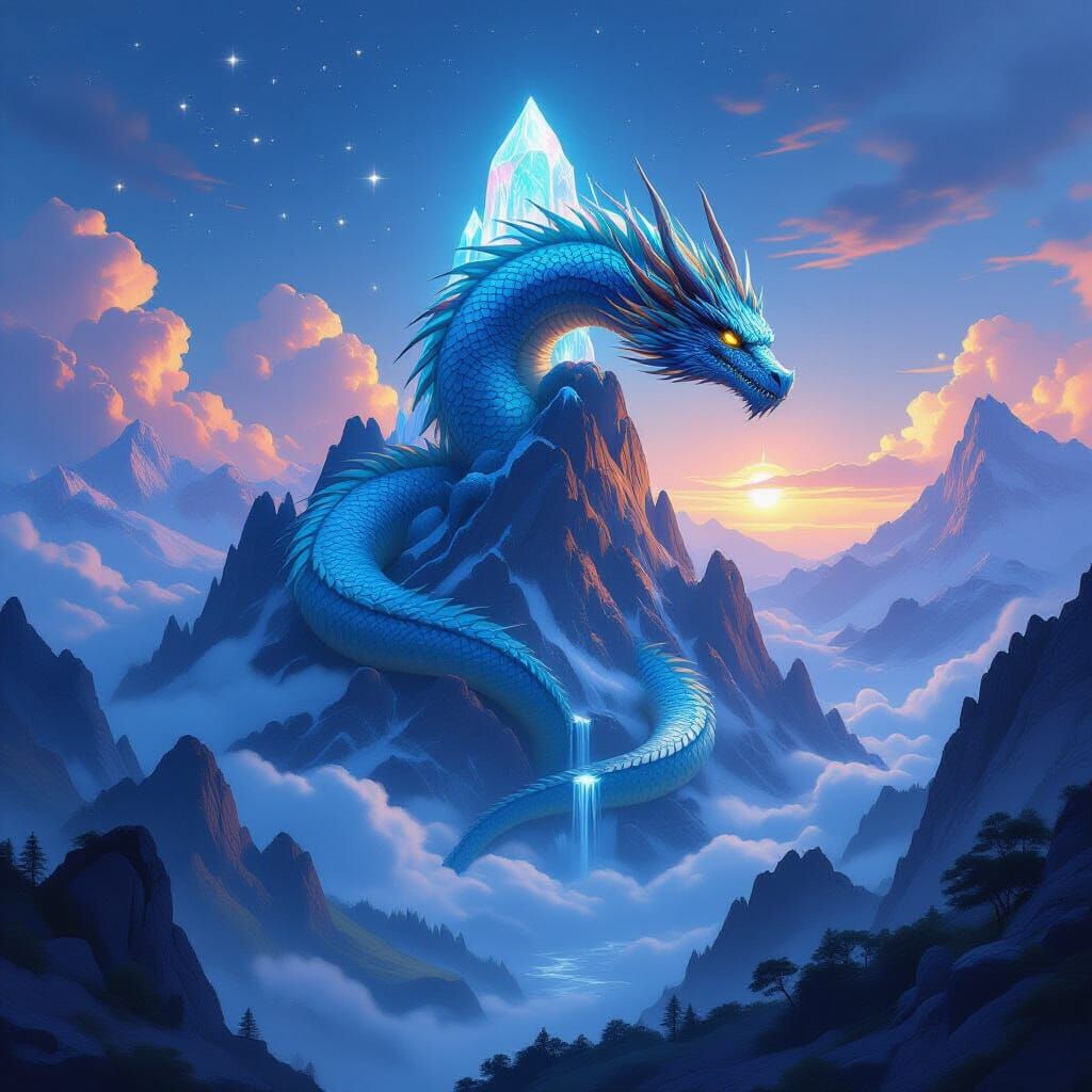 This image depicts a colossal dragon with shimmering scales resting on a mountain covered in crystals. A hidden valley below is lit by twilight and stardust, created in a grand fantasy digital painting style.