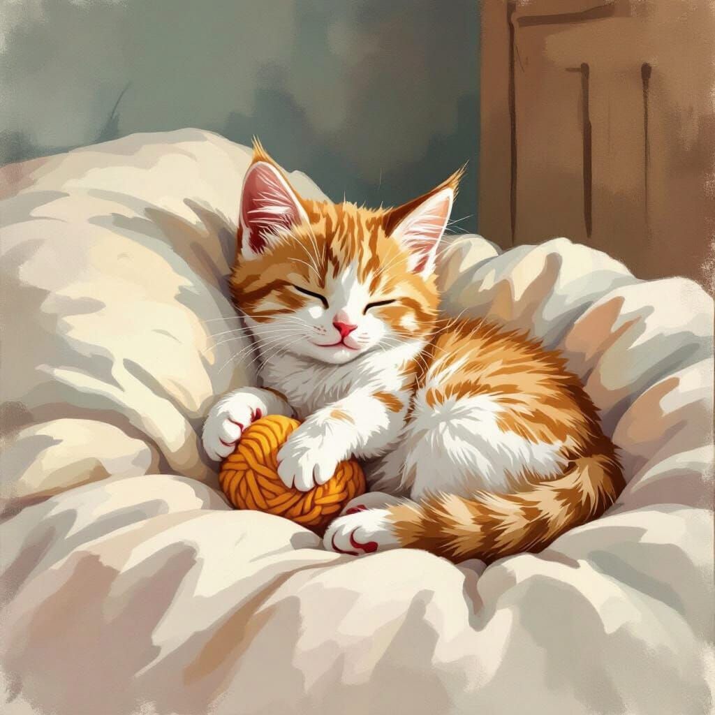 A charming image of a kitten playing with a vibrant orange ball of yarn on a soft bed. The illustration is in a watercolor style with soft textures and pastel colors.