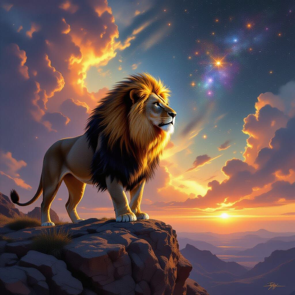 A breathtaking image of a lion with a golden mane observing a nebula. The scene is hyperrealistic with dramatic lighting, subtle textures, and incredible depth, reminiscent of cosmic digital painting.
