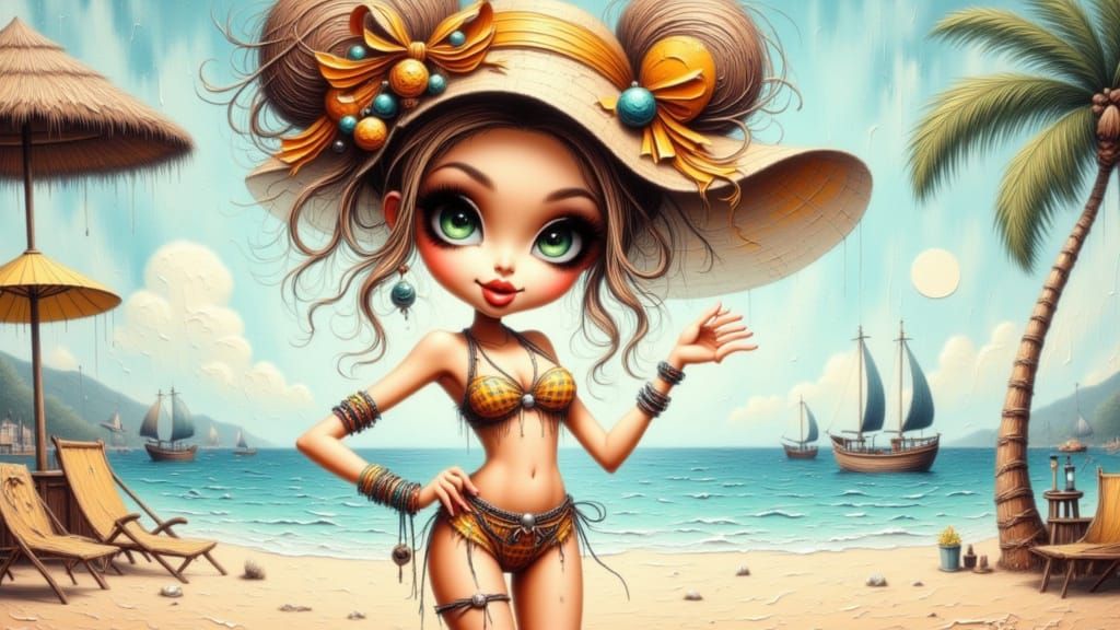 <lora:Moonchild Halloween:1.0> <lora:Whimsical:1.0> A Vibrant, Curvaceous and voluptuous Chibi anime fashionista betty boop babe, posing in a plaid-style Plaid yellow and black cheeky bikini, spaghetti string, with shoulder straps in the same pattern showing off her tummy. Disheveled ponytail light ...