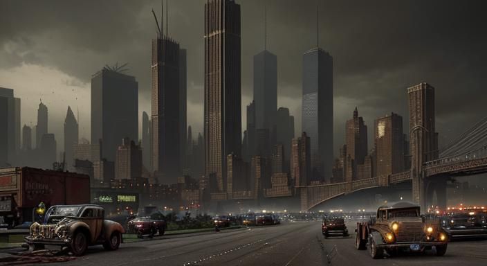 Create your own post-apocalyptic vehicle designs and urban battle scenes with our free AI image generator.