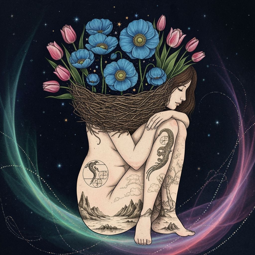 This image shows a woman carrying a nest filled with stars, symbolizing the connection between humanity and nature. Birds and flowers intertwine with her form in a dreamlike mindscape with vibrant, iridescent colors.