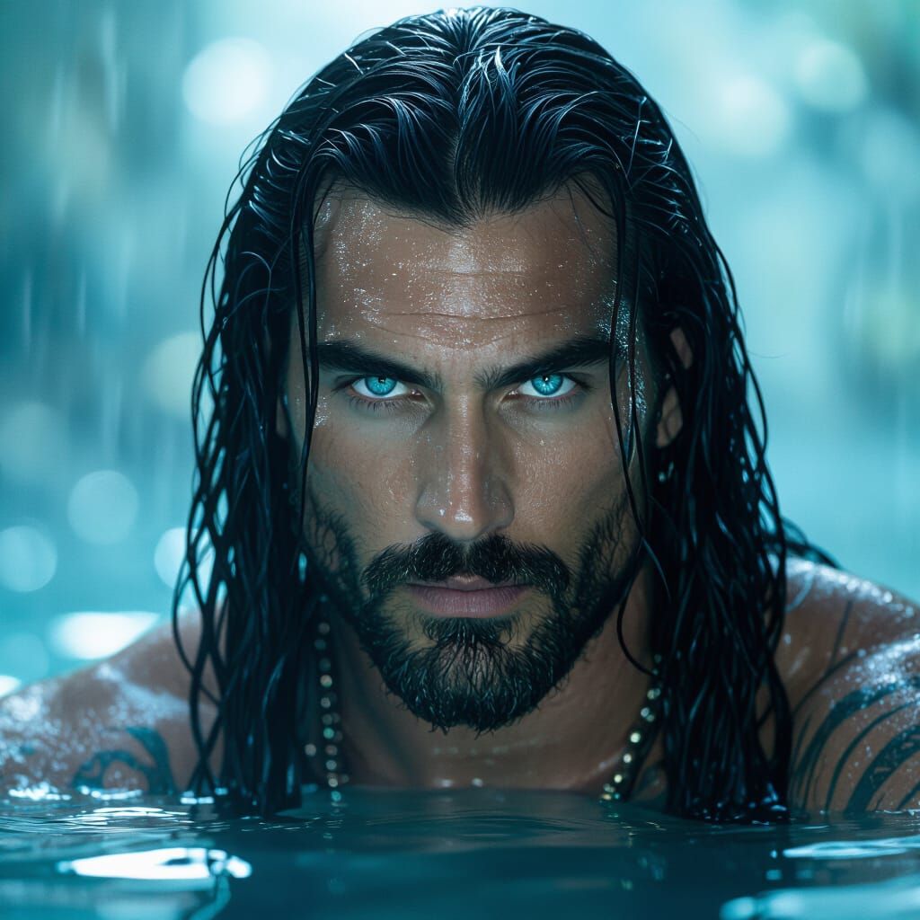 This cinematic film still captures a wise, ancient male warrior with long dark hair and piercing blue eyes, adorned with meaningful tattoos. Shot with atmospheric lighting and film grain for a dramatic effect.