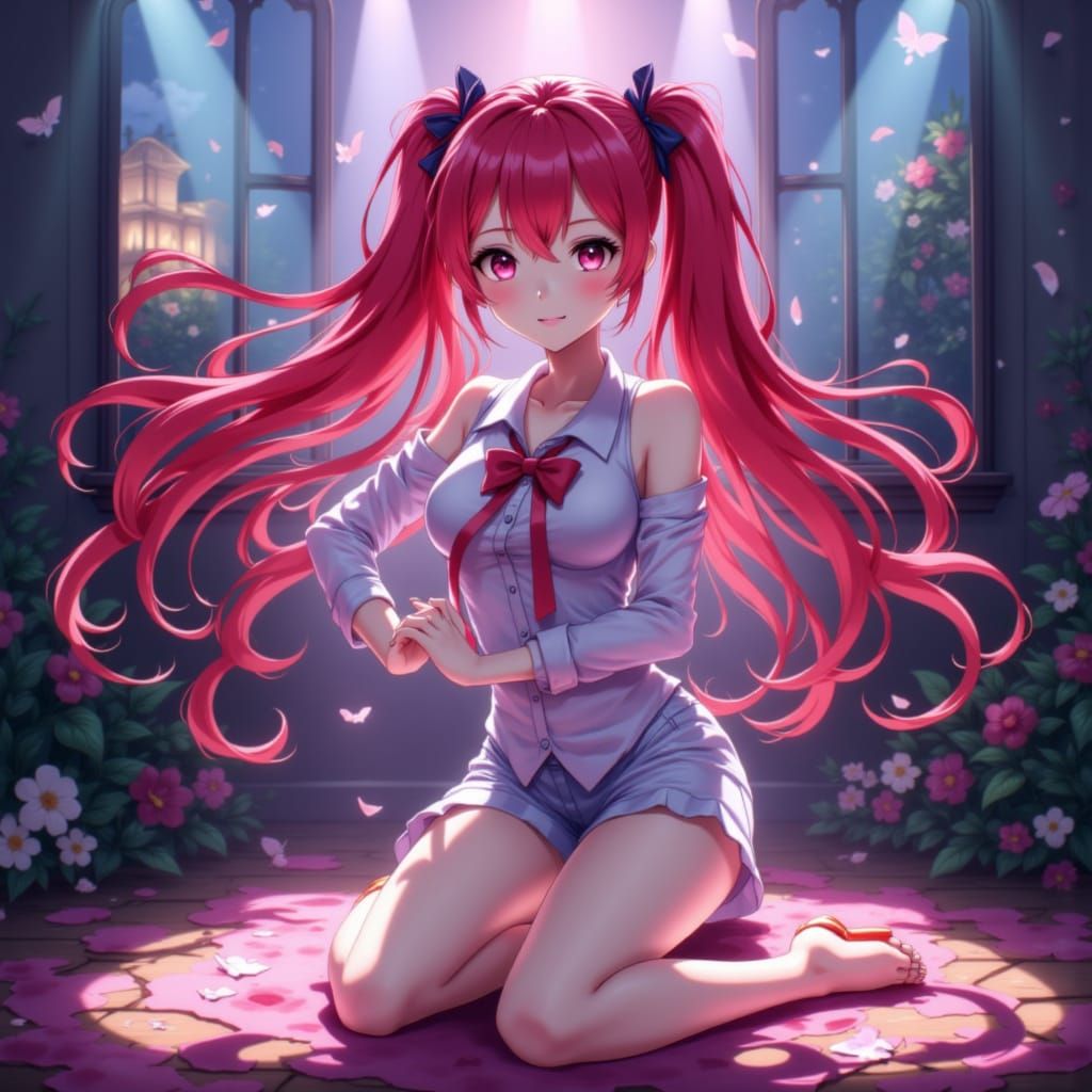 This highly detailed, realistic image shows an anime singer with long red ponytails performing energetically on a vibrant, spotlight-lit stage.