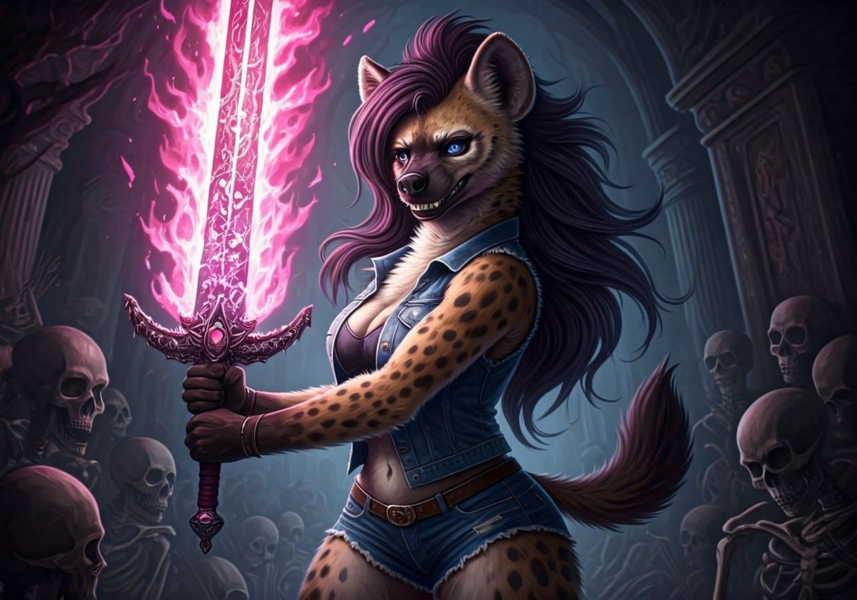 A striking picture of a hyena warrior wielding a flaming sword in a graveyard. The anthropomorphic figure has a mohawk and denim clothing, set against a backdrop of skeletons, illustrated in a maximalist style.