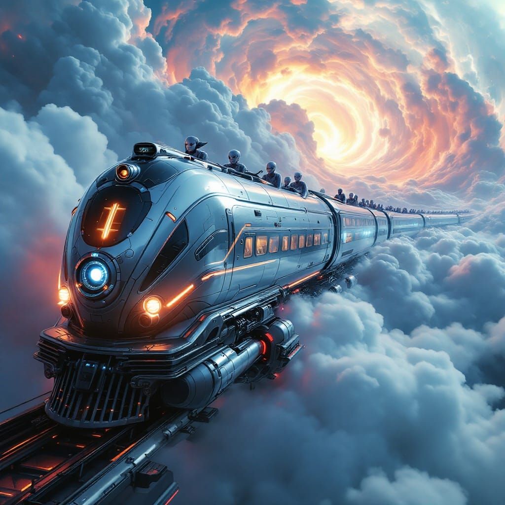 A cinematic image of a sleek, retro-futuristic sky-train soaring through a swirling, iridescent cloudscape, with intricate metallic surfaces, pulsing neon accents, and happy aliens in high-tech attire.