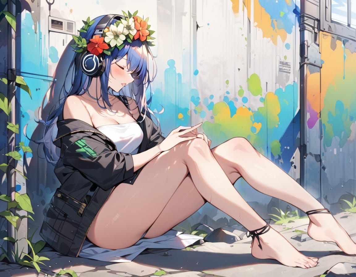 A watercolor painting of a woman sitting cross-legged with a bare chest in front of a colorful graffiti background. She wears headphones as a wreath and her body is draped with thin fabrics.