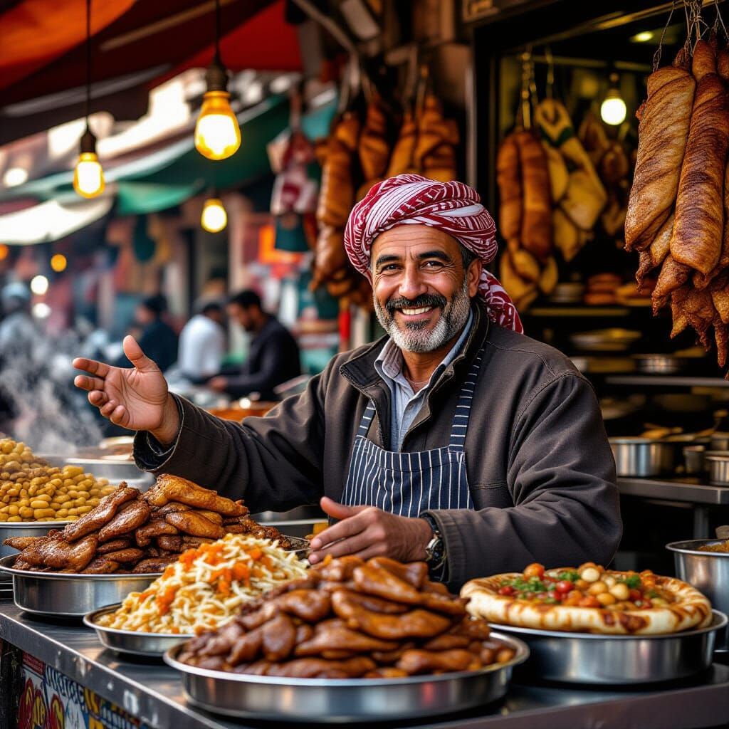 A vibrant photograph capturing a friendly shawarma vendor in a busy Marrakech market. The image showcases rich colors and textures, highlighting the vendor's inviting display in a photorealistic style.