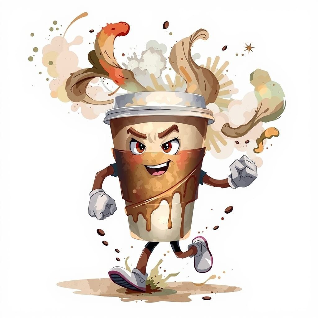 A sepia-toned watercolor of a coffee cup mascot striding forward with a determined expression. The fluid composition and steam effects create a dynamic, comic-style image.