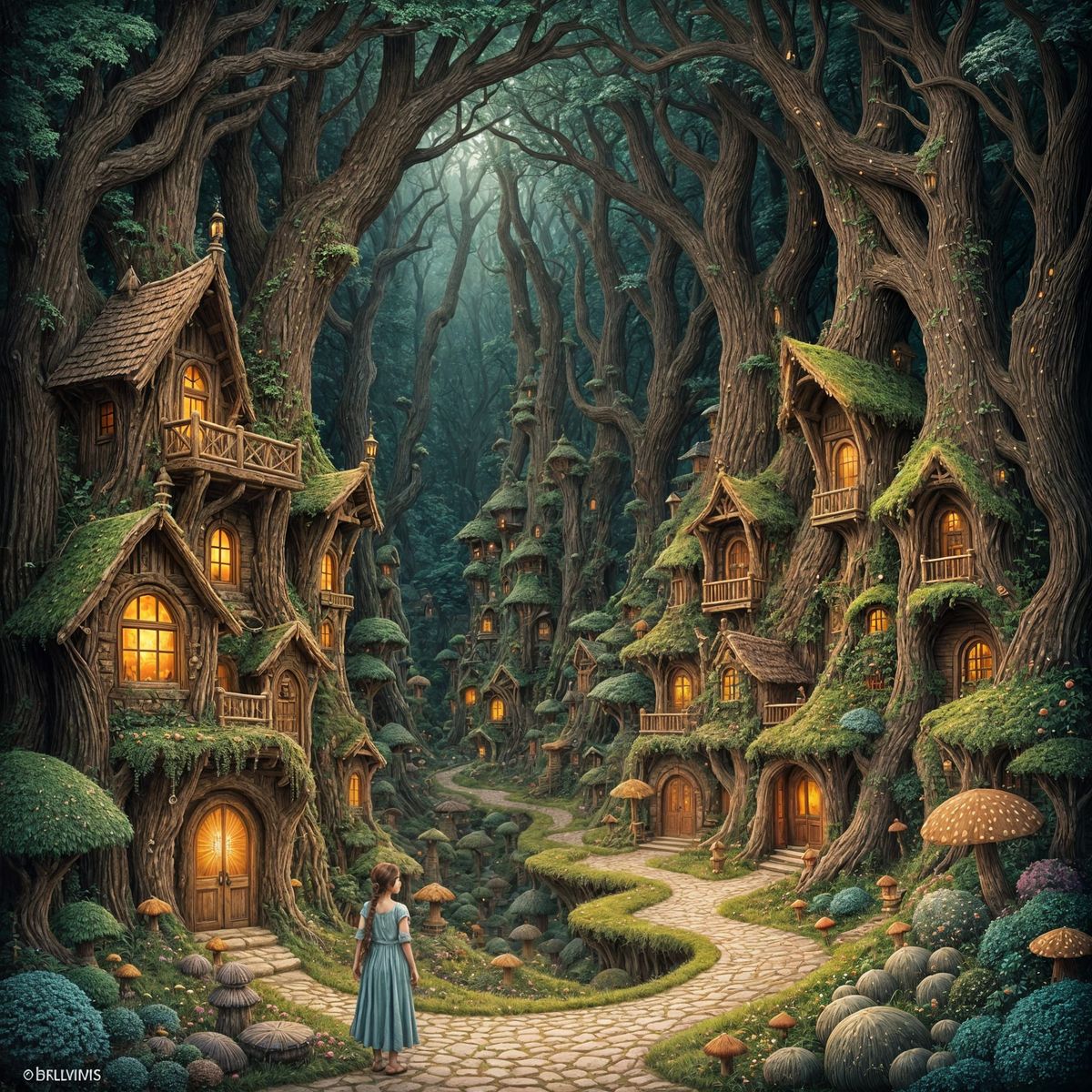 This image depicts a charming, hidden village built inside a massive ancient tree, featuring carved wooden homes and glowing mushrooms. Bioluminescent creatures add a soft glow to the scene, creating a nostalgic and magical atmosphere.