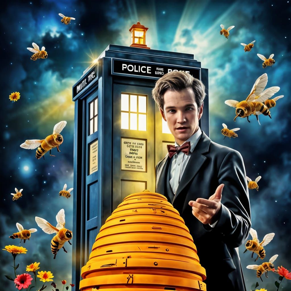 This image shows the Doctor from the popular sci-fi series standing heroically in front of the TARDIS, surrounded by a thriving beehive and busy bees. The artwork blends futuristic and whimsical elements in a vibrant digital style.
