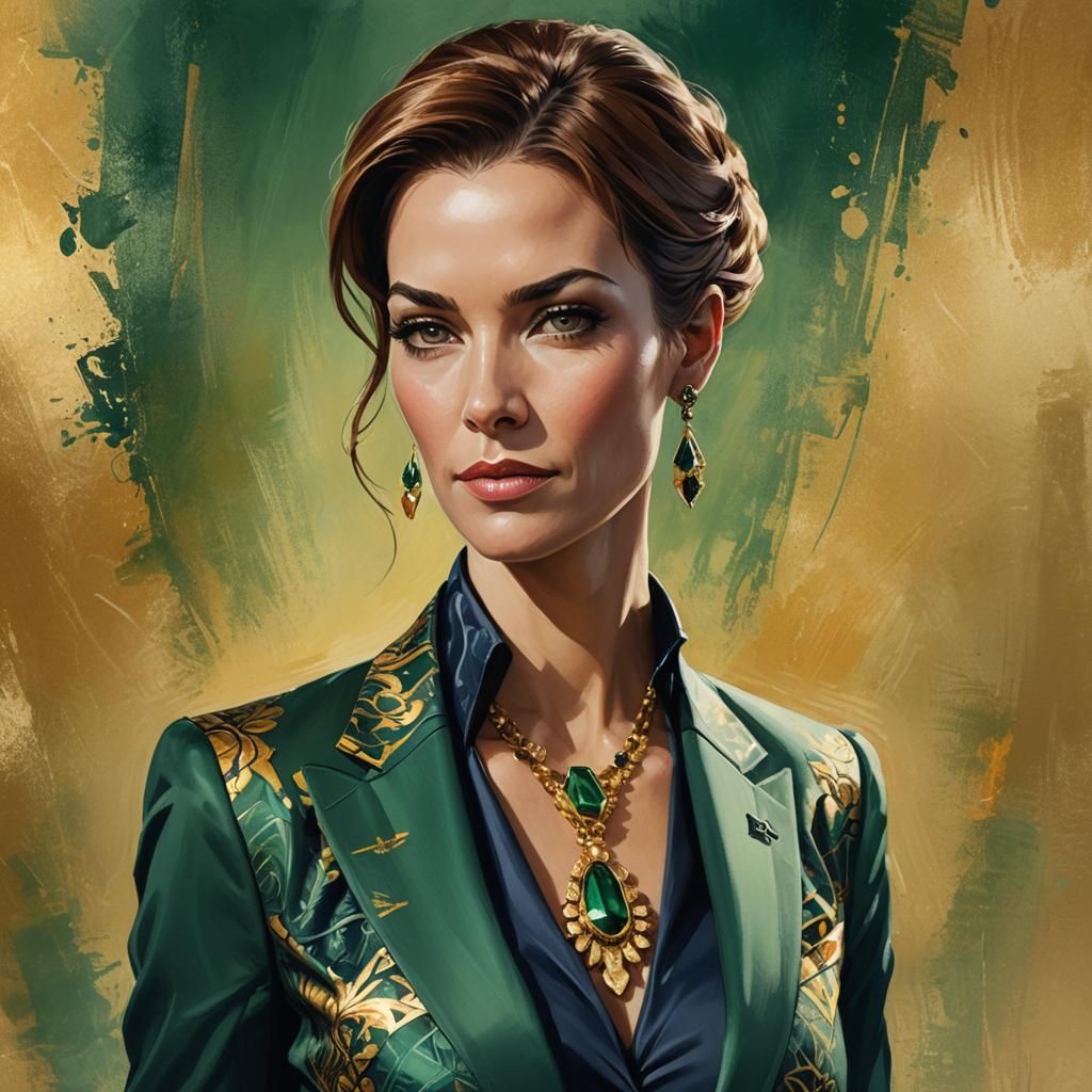 This image shows a confident businesswoman in corporate attire, reminiscent of art nouveau. The portrait features dynamic lighting, hyperdetailed textures, and a vibrant color palette with subtle lens flares.