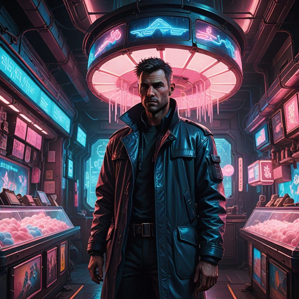 A retro-futuristic scene of a shopkeeper in a cotton candy store on an airship. Neon lights and brass fixtures illuminate the vibrant pink and blue treats in a neon noir aesthetic.