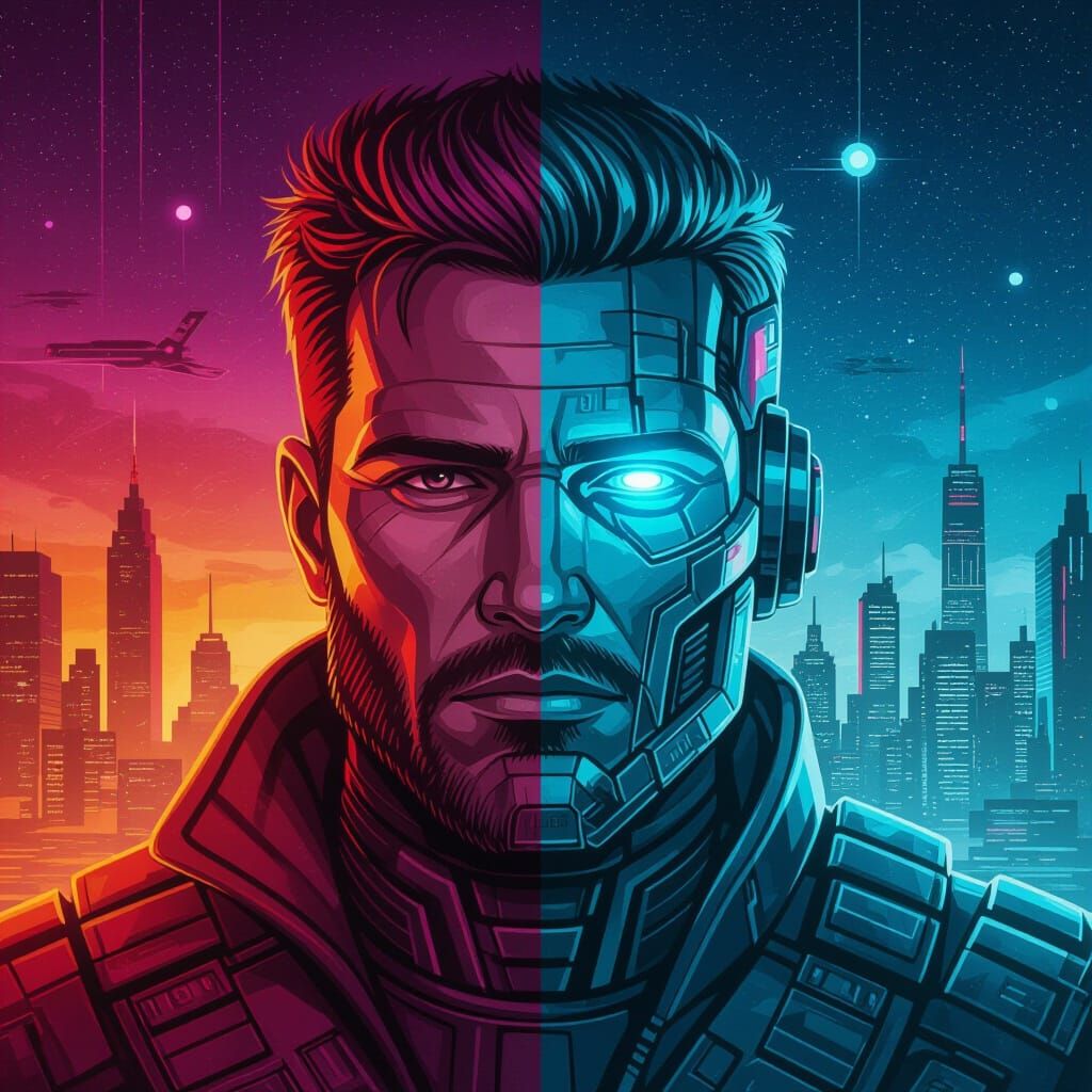 Ancient Man vs Futuristic Machine (((Half and half ))) Polyptych, 4 seasons in (((( Futuristic synthwave ; RetroSynth ; vintage )))) , separated by side by side linear panels, thick brush strokes , Hyperrealistic, watercolour art, concept art, mid shot, intricately detailed, color depth, dramatic, side ...