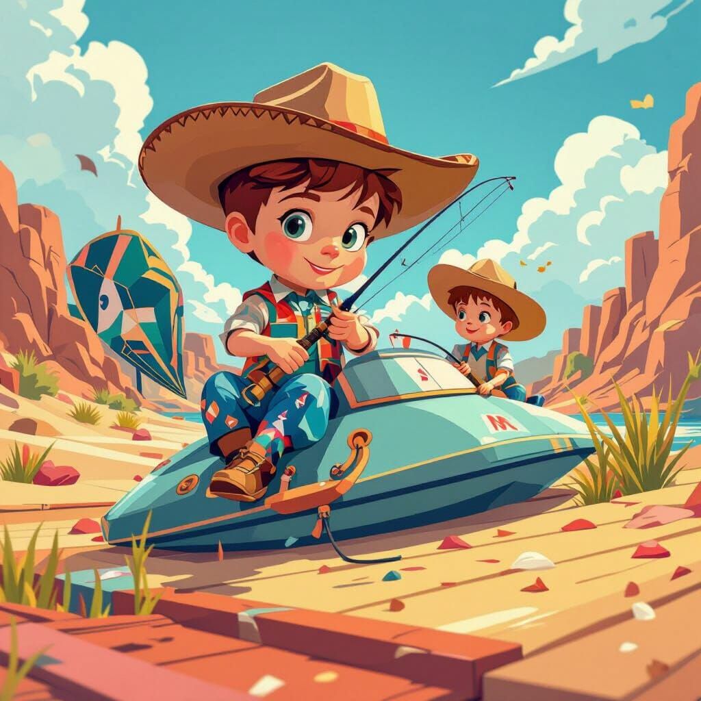 A vibrant scene of two boys fishing from a pier, rendered with geometric shapes and Art Deco elements. The image features dynamic lighting and rich textures in a maximalist style.