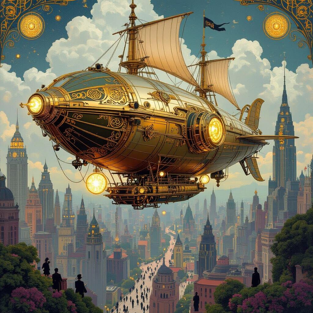 A captivating image of a steampunk airship adorned with golden details, sailing over a bustling art-deco city. The scene blends industrial elements with lush gardens and intricate details in an opulent aesthetic.