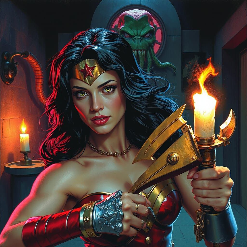 This image shows Wonder Woman in a tense battle against Cthulhu in a dimly lit, cyberpunk-inspired chamber. The artwork is created in vibrant oil gouache style with high contrast, polychromatic colors and neon hues.