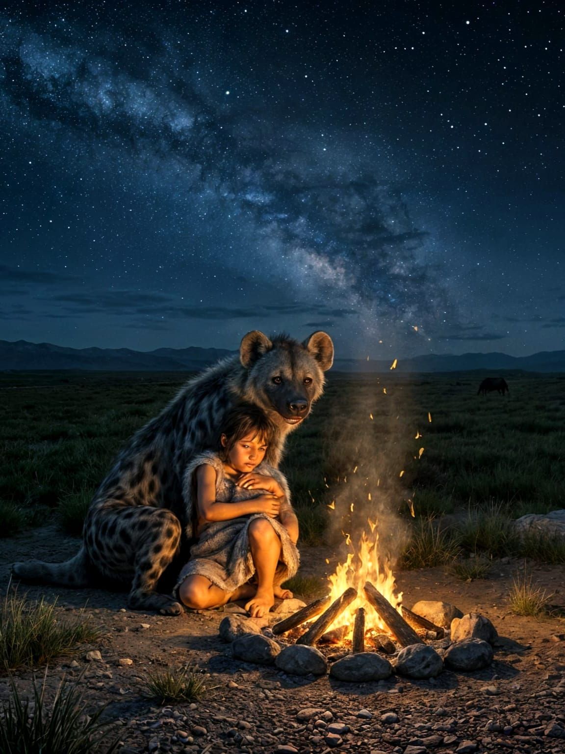This image shows a Neanderthal child embracing a tame cave hyena near a fire. The scene depicts the open grasslands of the Levant 50,000 years ago in a realistic graphic novel style.