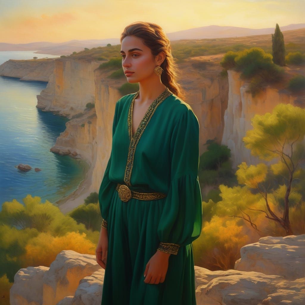 This image shows a woman standing on a cliff in Cyprus at sunset. The vibrant oil painting features triadic colors, golden sunlight, and lush green trees in a serene landscape.