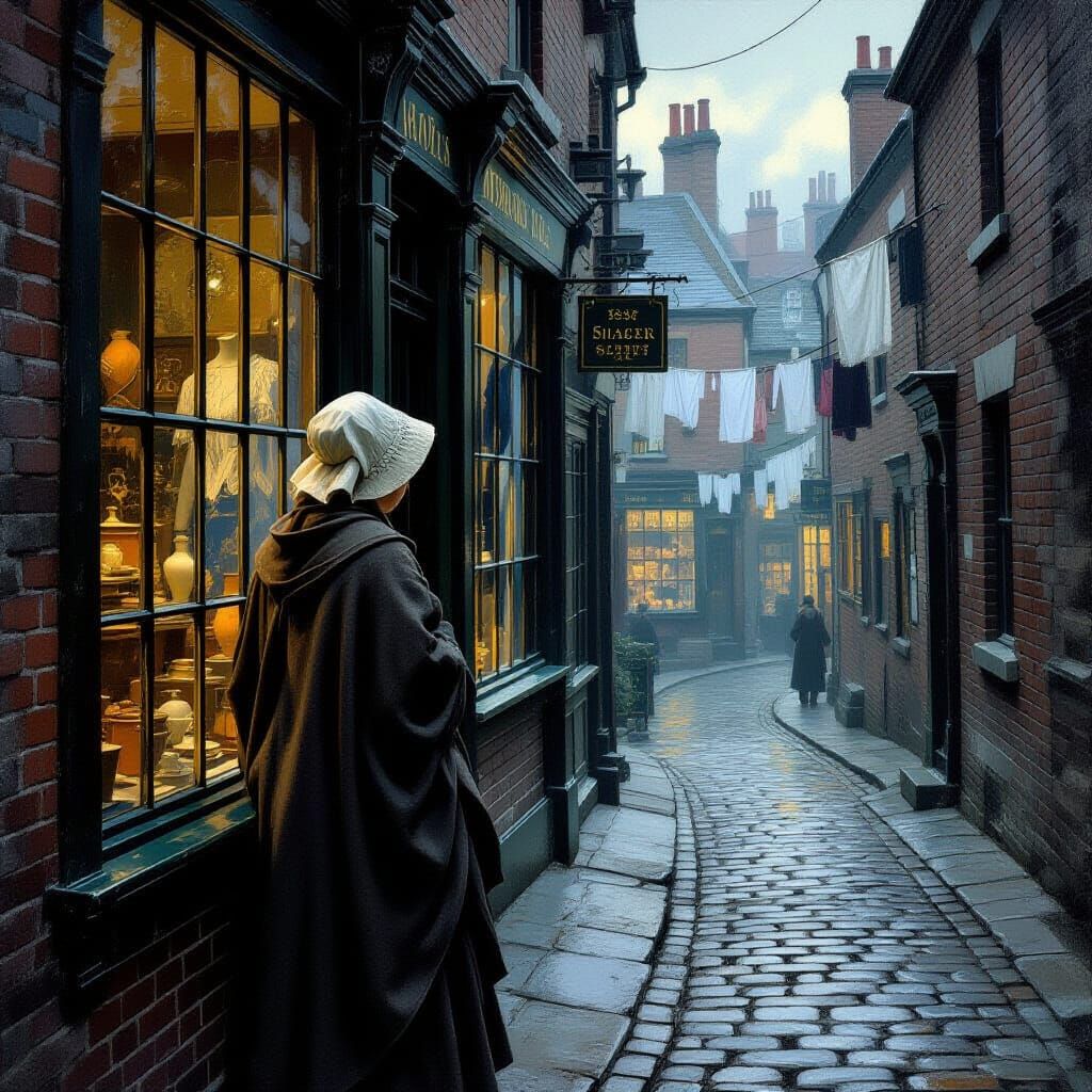 This image shows a woman in period clothing gazing into a shop window on a Victorian street. The scene evokes a soft, atmospheric aesthetic reminiscent of 19th-century tonalist paintings.