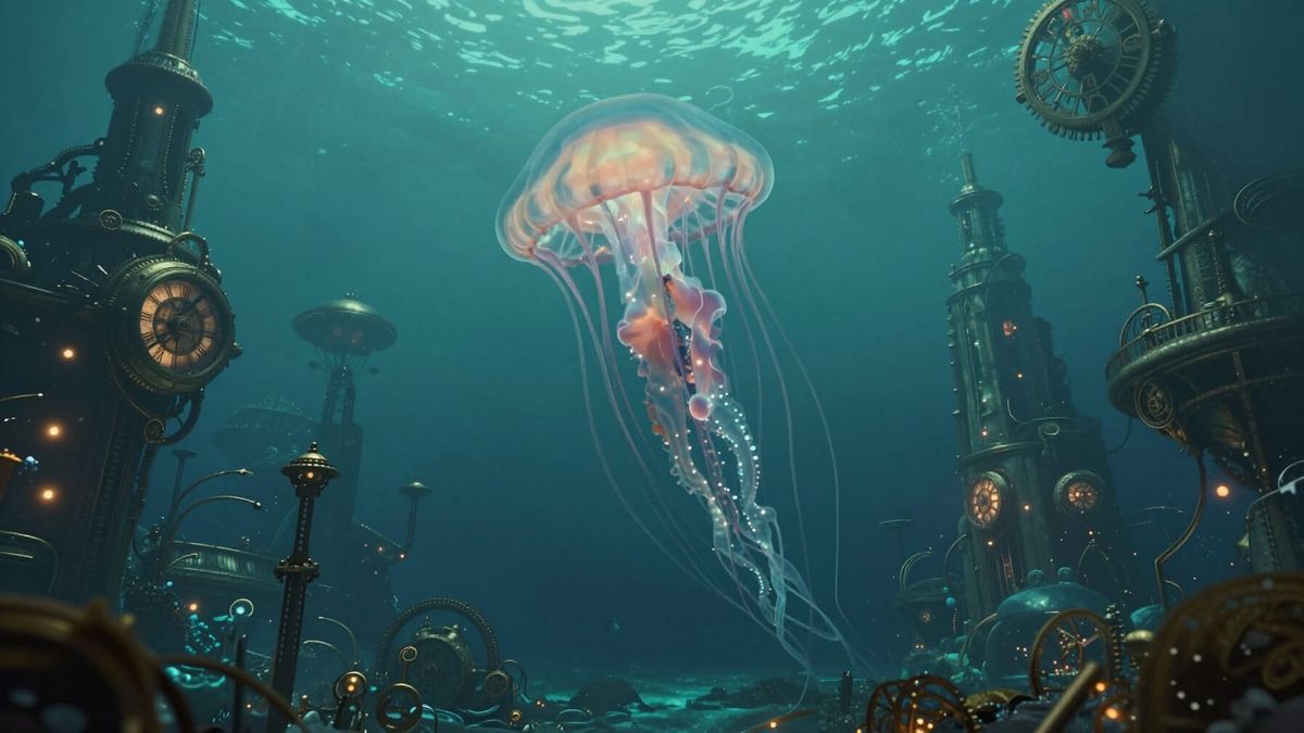 A colossal, ancient jellyfish gracefully drifts through a forgotten steampunk city submerged beneath a turquoise ocean. Its bioluminescent tentacles illuminate intricate clockwork structures and grand, waterlogged architecture. The mood is one of eerie discovery and majestic solitude, captured in a detailed, ...