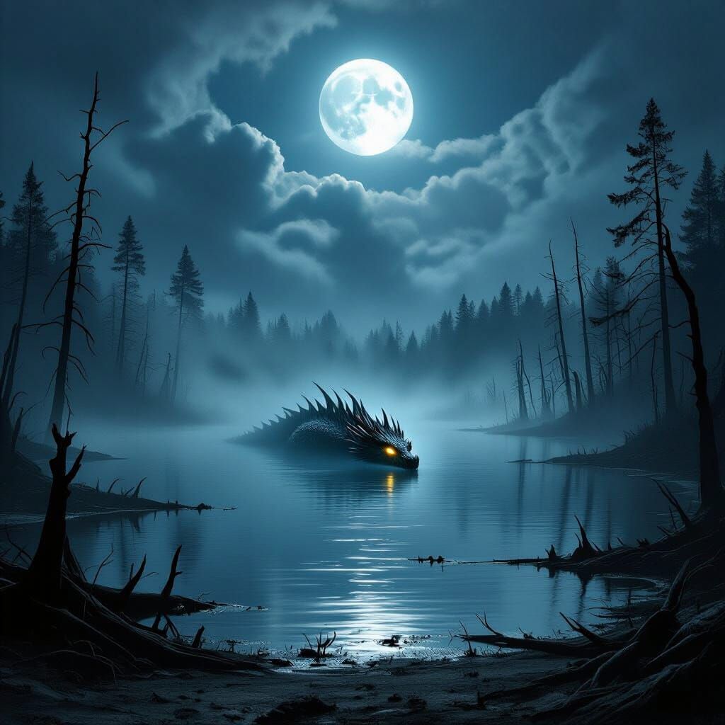 A colossal dragon with glowing eyes swims in a mysterious, fog-filled lake under a full moon. The scene evokes an eerie and unsettling atmosphere with a decaying forest backdrop.